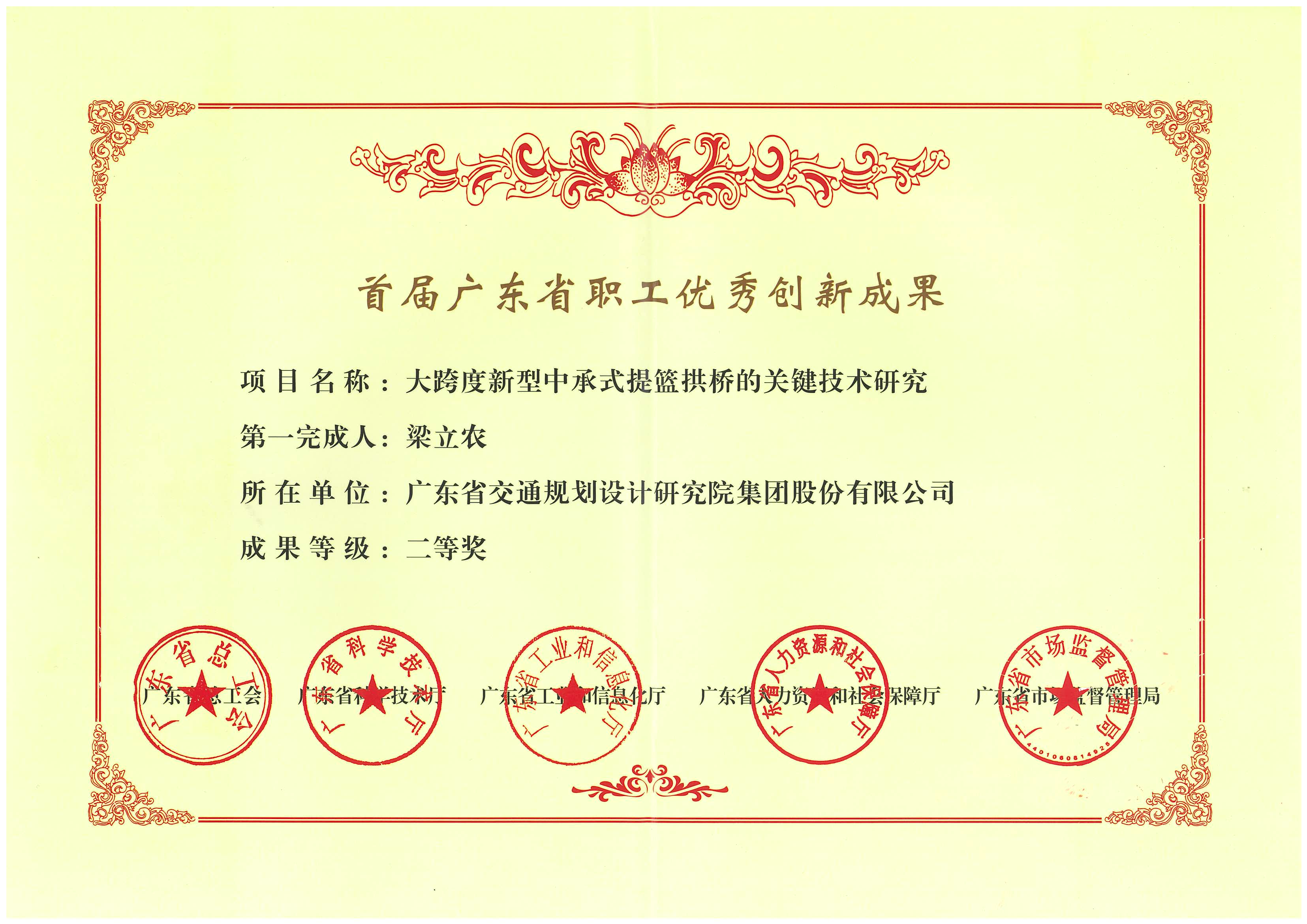 公司梁立农创新工作室《大跨度新型中承式提篮拱桥的关键技术研究》项目获广东省职工优秀创新成果二等奖