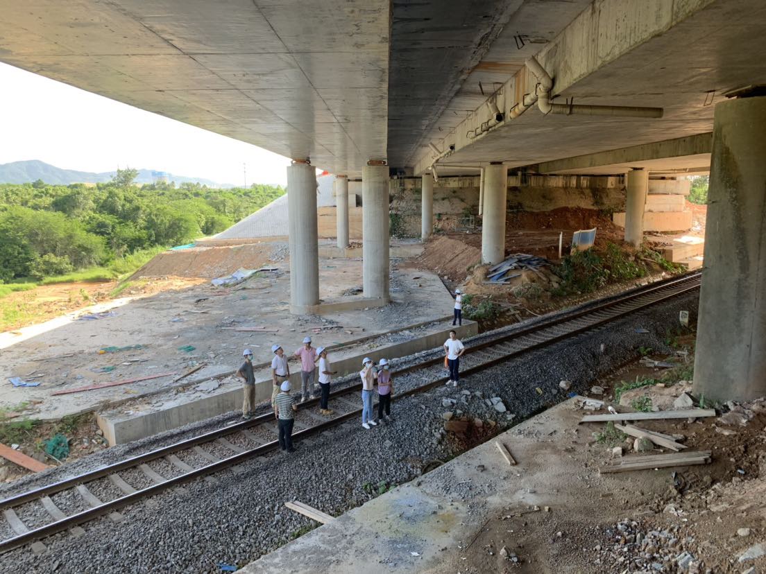 此次设计回访参观了阳阳铁路跨线桥及T1标的预制梁现场、天桥拆除现场。阳阳铁路跨线桥由于桥下铁路与该桥斜交,为满足铁路行车要求,新旧桥采用连续箱梁不等跨拼接,拼接段采用高性能砼。作为项目的技术难点工程,不等跨拼接结构受力复杂,施工难度大。在参观现场,回访团队与业主单位、施工单位就拼接带高性能砼施工、老桥支座顶升、护栏改造、上跨铁路桥等关键技术,进行了深入沟通和探讨。随后,大家前往预制梁场进行参观。作为平原区改扩建项目,本项目的桥梁以中小跨径为主,梁板类型较多,有5m、8m、10m、13m、16m、20m空心板梁以及35m小箱梁共7种类型。项目负责人和设计代表对于现场每一种梁板类型,详细讲解了设计控制的难点和要点,并听取了业主和施工单位反馈的问题和意见,结合现场钢筋布置答疑解惑,为后续同类桥梁设计积累了经验。